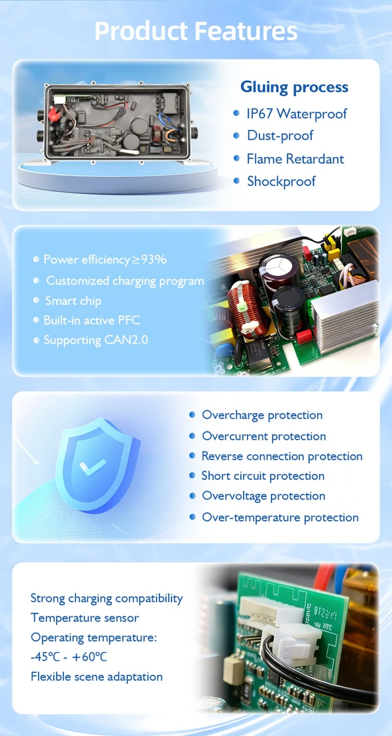 Cum ampla intentione amplitudinis 90-260V AC, hoc 1.2kW OBC Onboard scutariorum Pugna Patina in Sinis facta compatitur cum potentiis gridis in omnibus regionibus circum orbem, tollendo necessitatem convertentium ad usum internationalem addito intentione. Firmum 48V/25A output conservat etiam cum initus voltage fluctuat (±10%), ut congruenter incurrens ad 48V sarcinas altilium in vehiculis electricis, forklifts et marinis instrumentis.