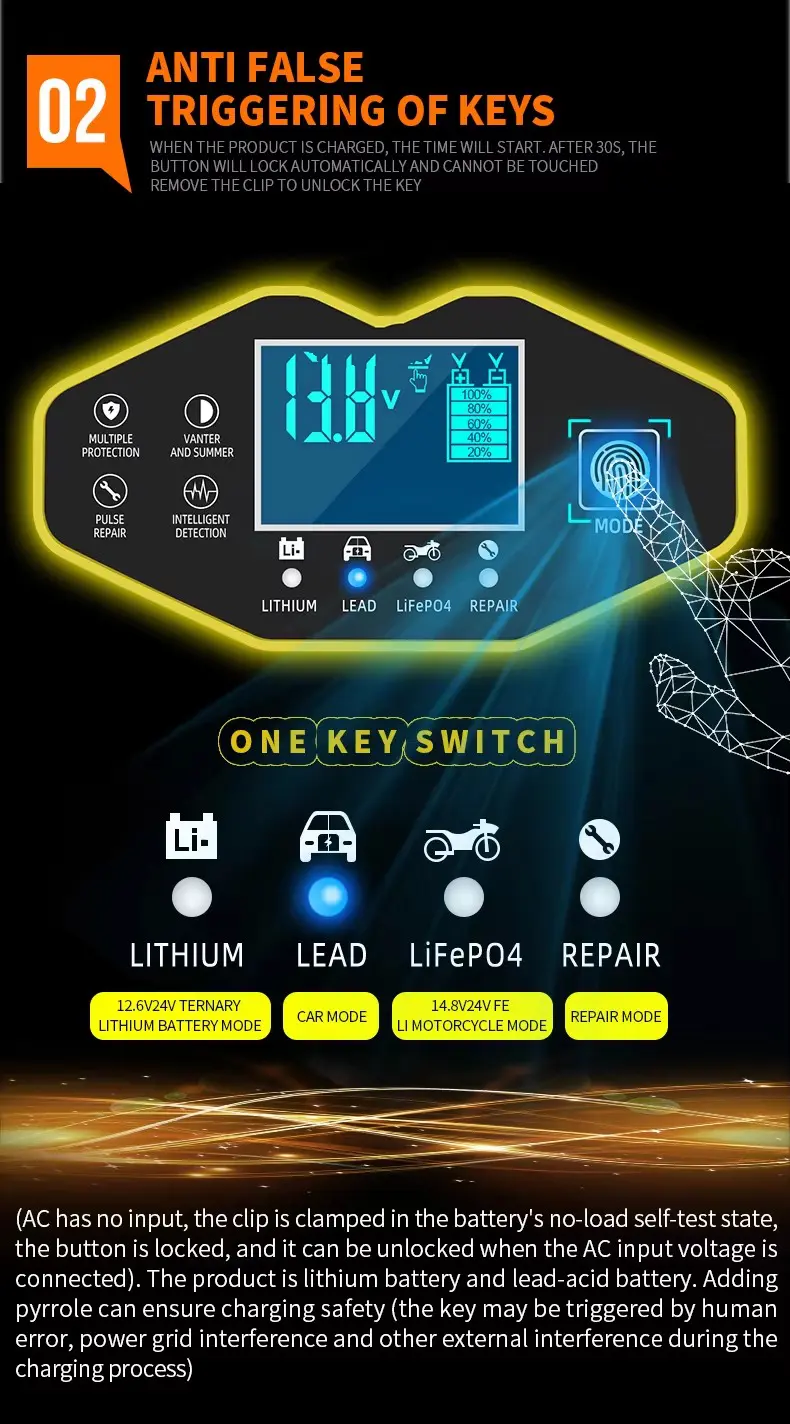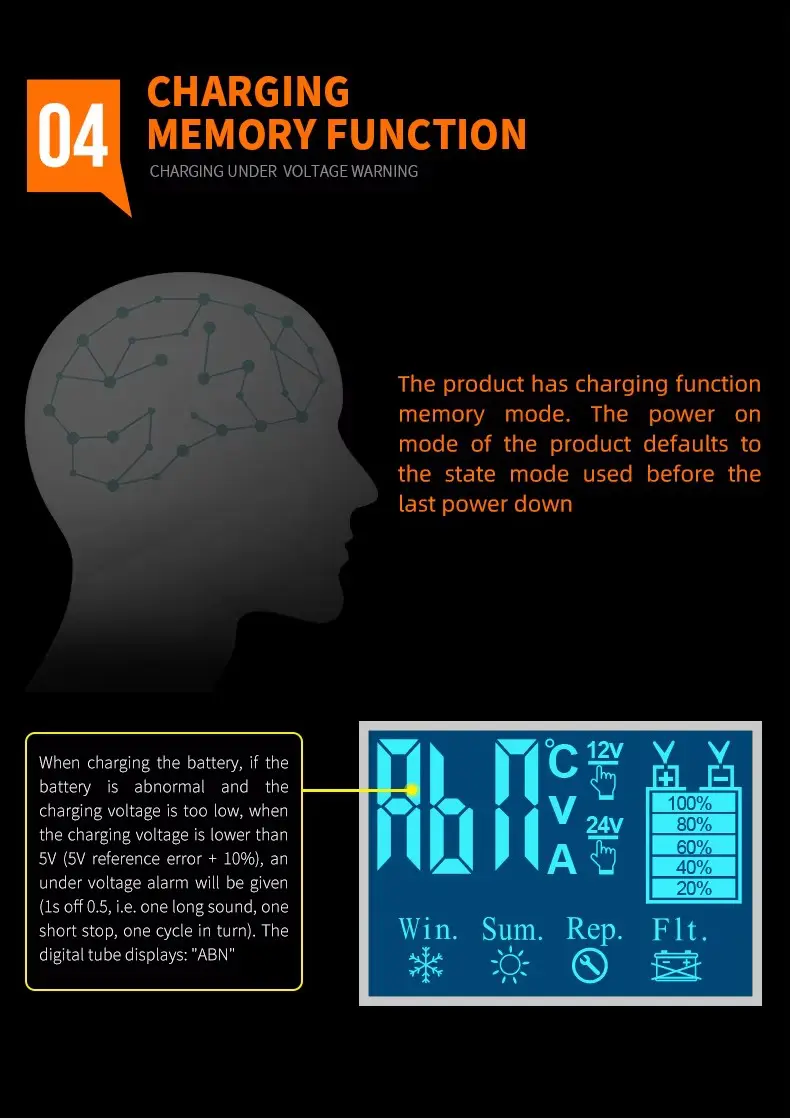 2. Optimized datos euismod Haec patina 12V in 6A et 24V in 3A praebet, cum maxima output of 110W et 85% efficientiam sub onere pleno. Automatic 7-scaena captiosae progressionis desultationem involvit, initium mollis, molem increpans, effusio, analysis, reconditioning, et natant sustentationem. Dedicatus hiemalis modus in frigidis temperaturis securum impetum facit, dum LCD ostentus te monitorem intentionis, currentis, et altilium in tempore reali temperatura permittit.