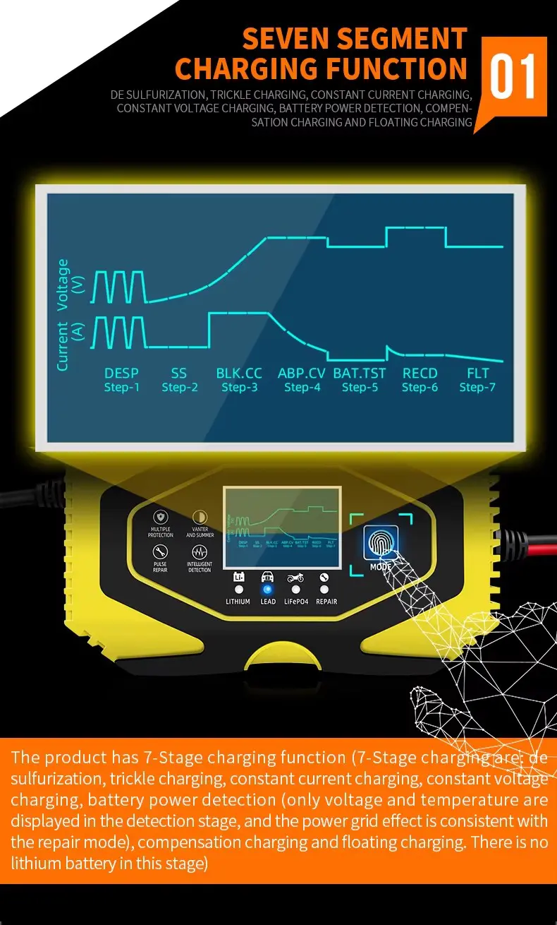 Propositum 7 scaena praecipiens efficit curam optimalem pugnae: desulfationem, initium mollis, molem decurrentis, effusio, analysis, reconditio, et natant sustentationem. Hi gradus concurrunt ut altilium vitam extendant, gravidae sulfationes recuperent, ac ne graventur.