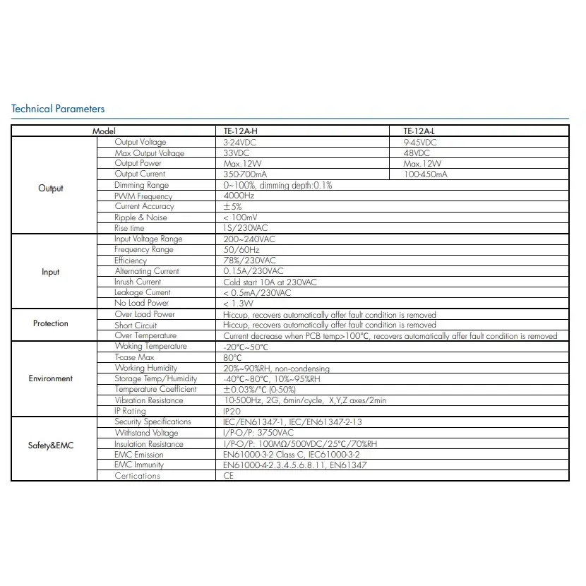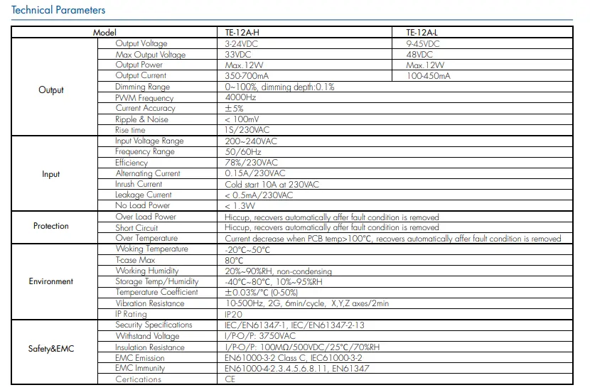Input intentione: 200-240VAC 50-60Hz Input current: 0.15A Potentia output: 12 Watts Max Output voltage :9~42V Warantum: 2 annorum Testimonium: CE/Rohs