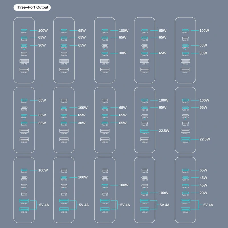 GAN 200W Fastigium patinae 4 USB-C + 2 USB-A 200W PD Charger USB A1/A2: 5V/3A 9V/2A 12V/1.5A (18W Max) |