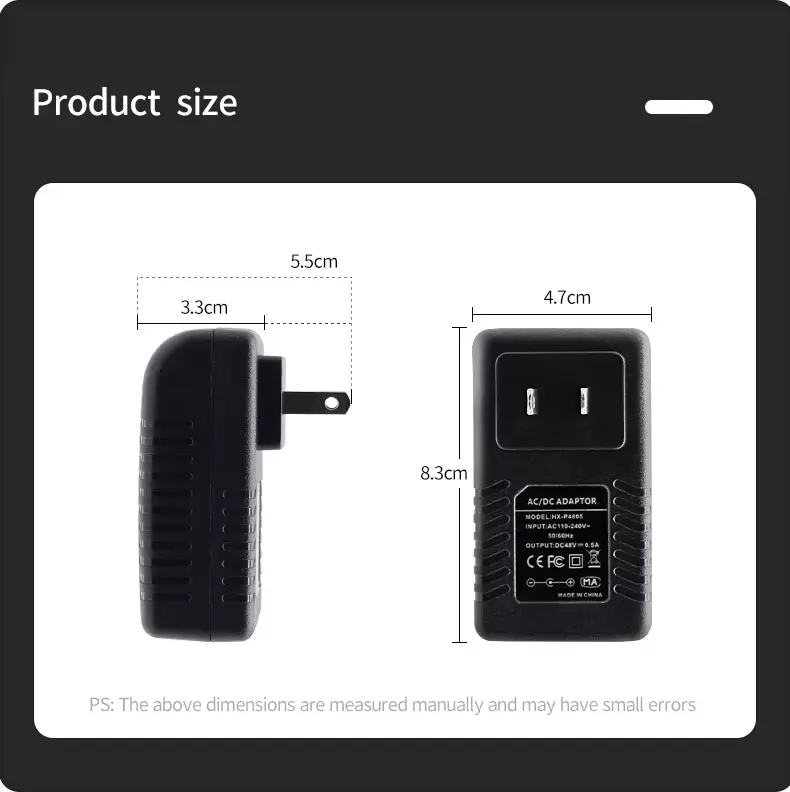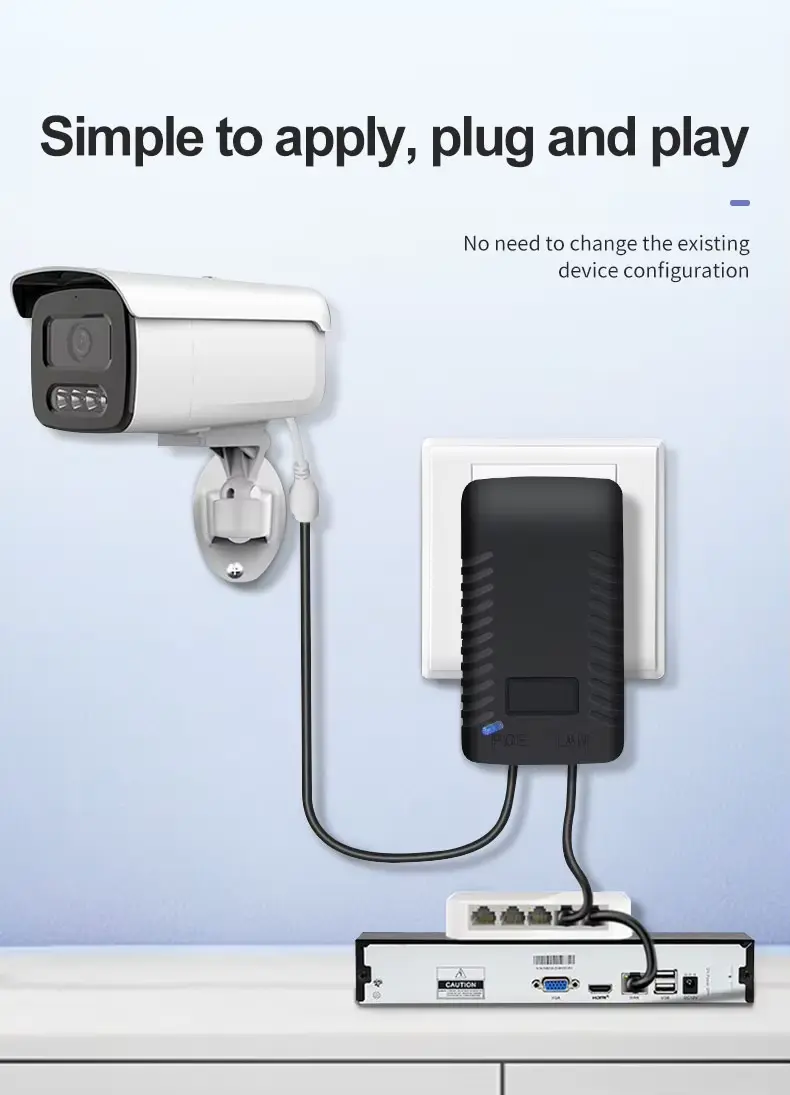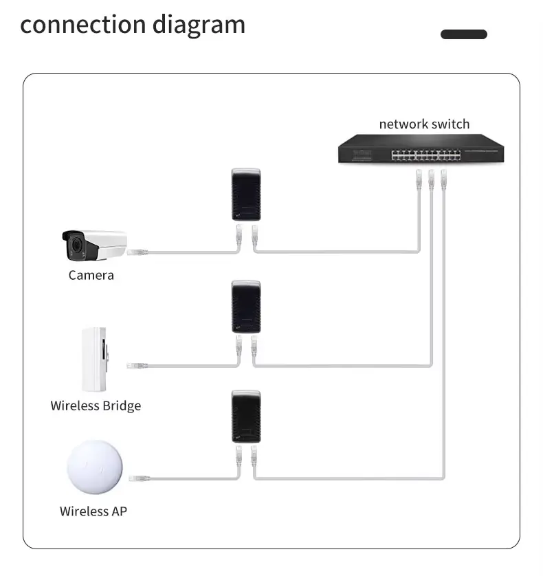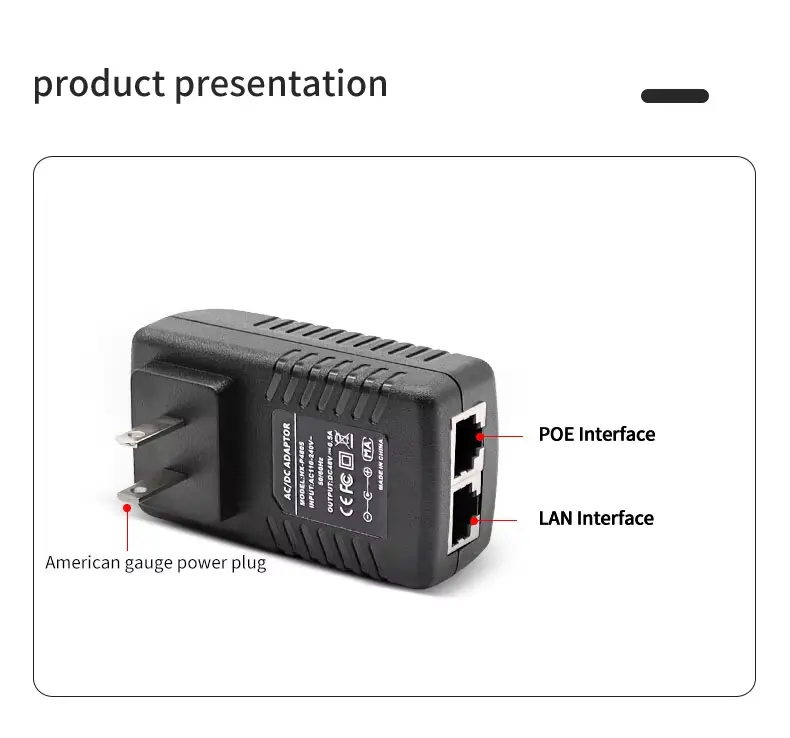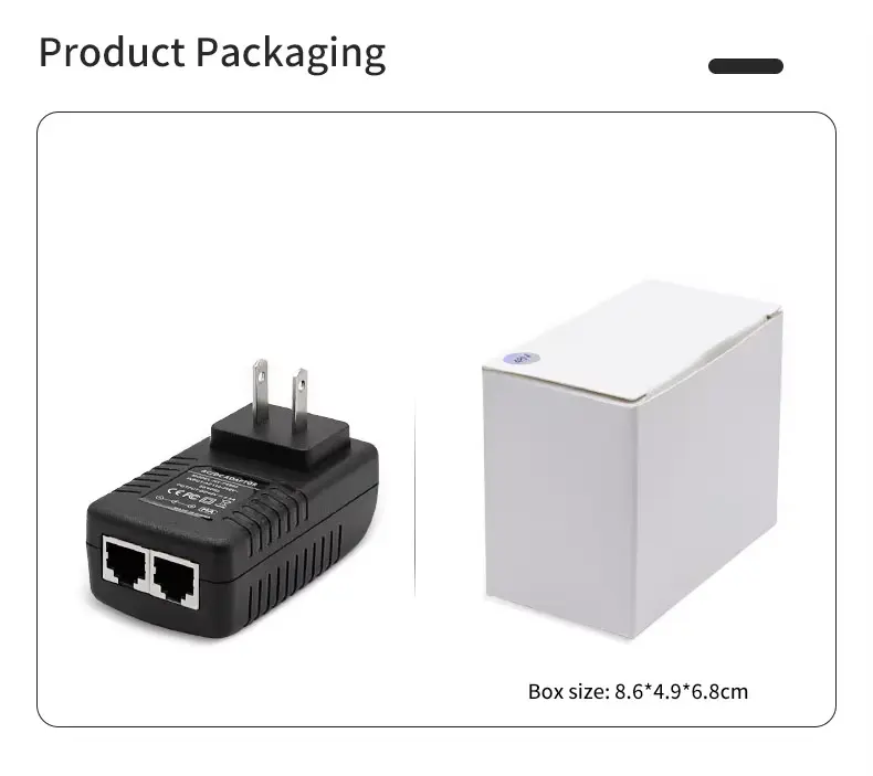 Magna compatibilitas Nota: PoE injectorem passivum est. Machinam cum connexis notis non facit. Quaeso, ut accipias machinam tuam peculiariter aestimatum sit pro 48V PoE passivum (vel range quod 48V includit) antequam connexionem contineat. Connectens cum consilio exspectans 5V, 12V, vel 24V damnum causare potest.