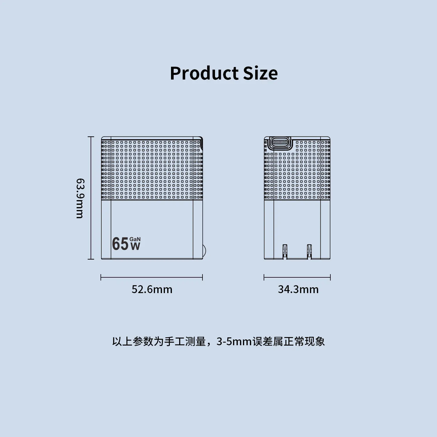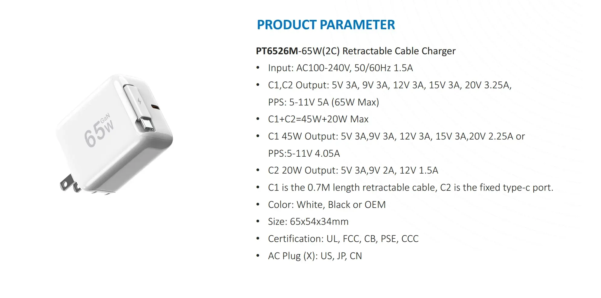 Dual USB-C Portus: 65W PD 3.0 Patina, simul duas machinas arguere potest. Per duos processus incurrentes, potestas sortita est 45W et 20W.