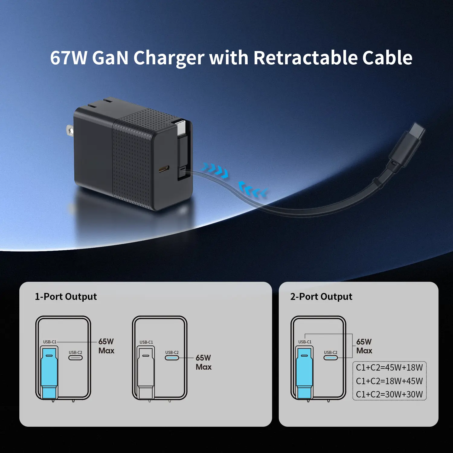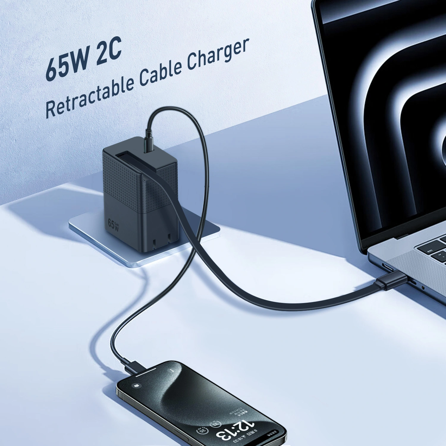 Instructus Retractabilium cables: 65W Fasti Incurrentis adaptor instructus opportuno et non-tangulo 2.3-pede (1-meter) USB-C longi data remulco. Funis hic aequaliter potest extendere et retractare, sic evitans cluttam e nexibus contortis et cupiens ut quovis tempore accusare possis.