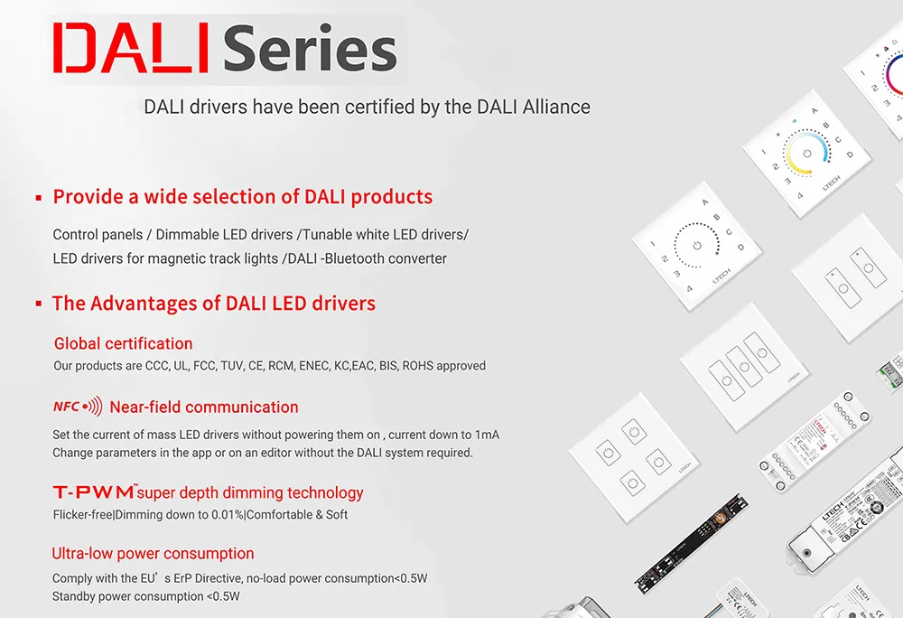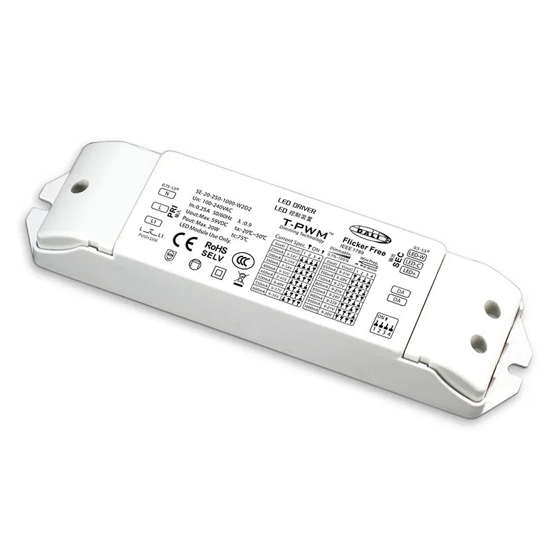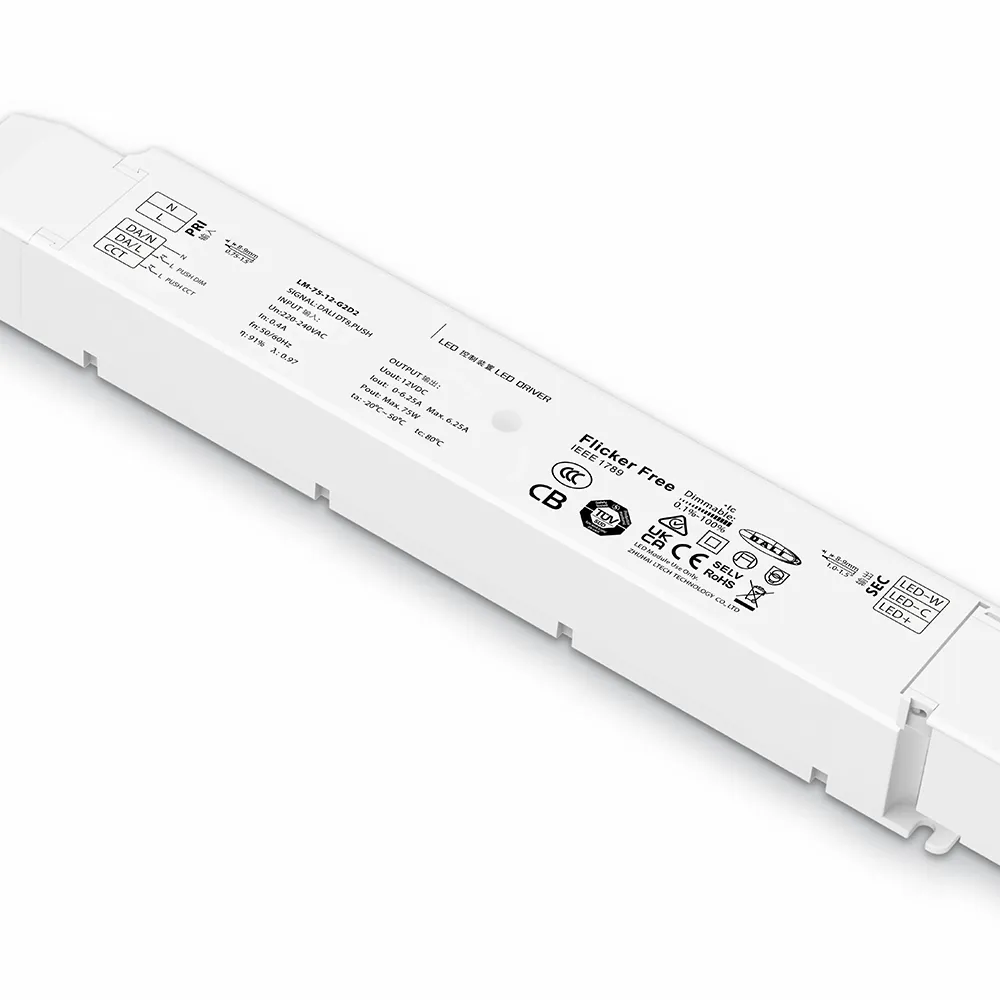 Hoc DALI coegi notat constantem intentionem 12V±2%, sine motu congruenter illuminationem praebens. Accepit universalem inputationem intentionis 100-240V AC, aptam ad usum globali faciens. Cogitatus operatur magna efficacia usque ad 90%, reducendo industriam vastum et calorem generationis. Continet plenam tutelam contra breves circuitus, onerare, nimia intentione, et nimis temperatus. Cum diuturna habitatione metallica et IP65 aestimatione, contra pulverem et rumpit aquam munitum est, ut certa effectus in ambitibus tectis et velit (operans temperatus range: -20°C ad +50°C). Instrumentum DALI adiuvat obscurationem ab 0.1% ad 100% sine sono audibili, permittens leves et flexibiles commensuras.