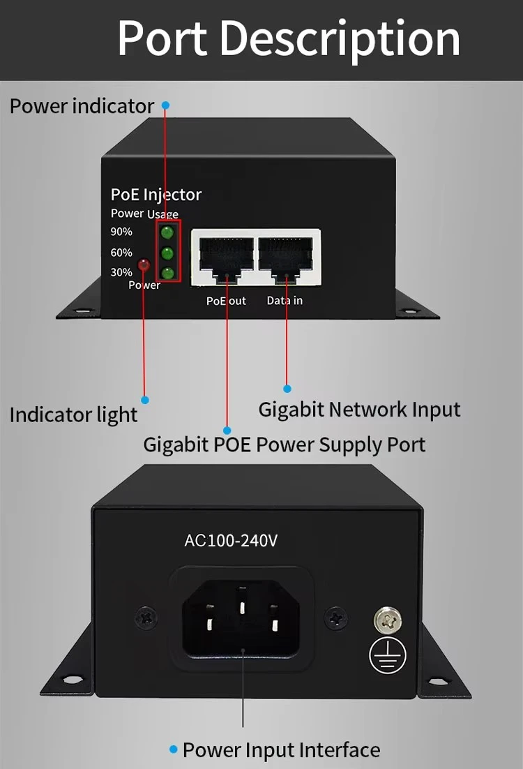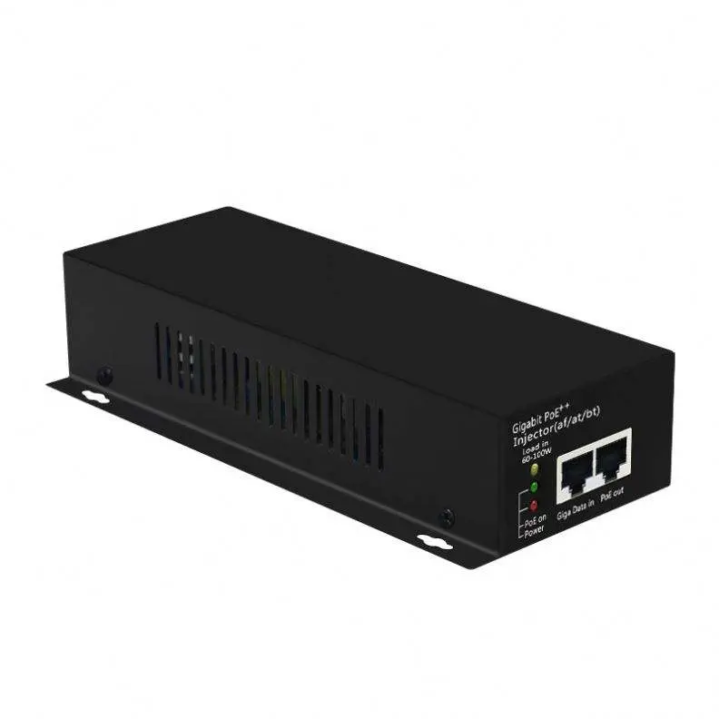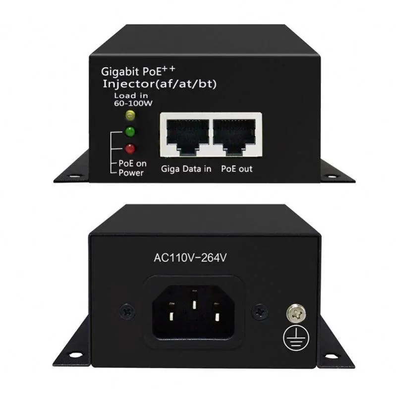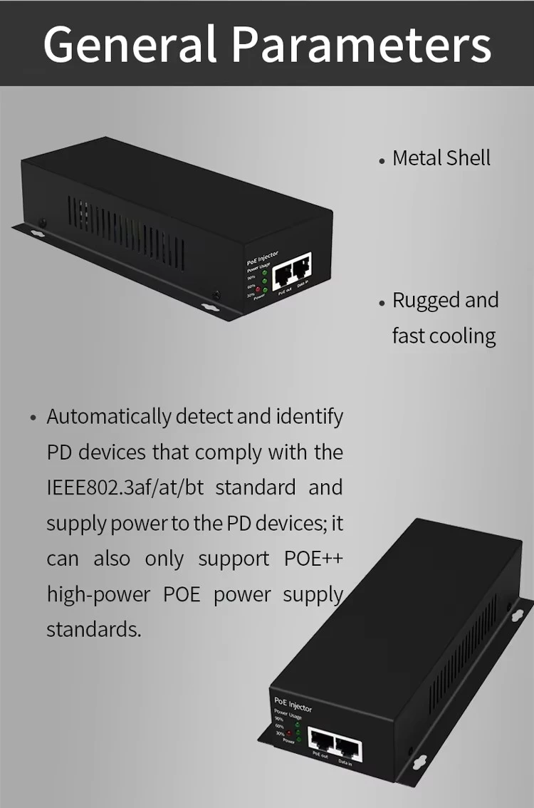 Maximum qualitas Active 60W POE Injector offertur a fabricante Sinarum Starwell. Is plumas unam 10/100/1000Mbps datae initus portus et unum PoE (Data+Power) portum output. Alterum verticitatem requisita 802.3bt plene sustinet, adhibitis omnibus quattuor paribus (1/2+,3/6-&4/5+,7/8-) pro simultaneo notitiae tradendae et 48V DC copiae potestatis.