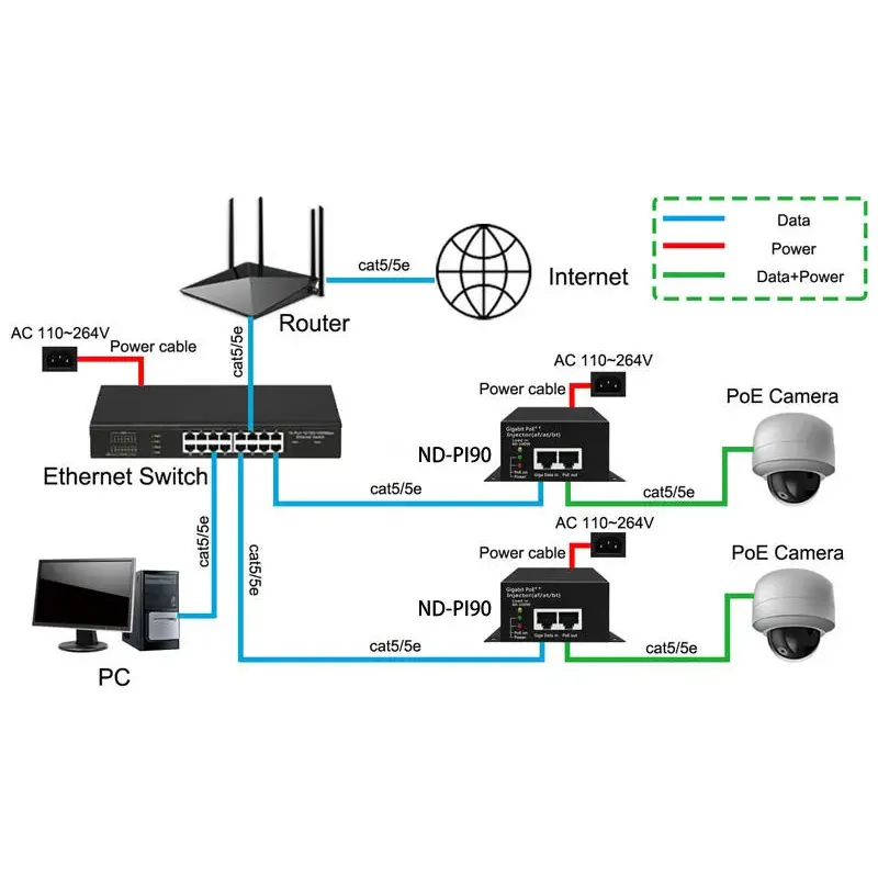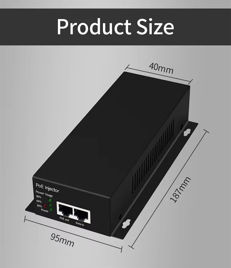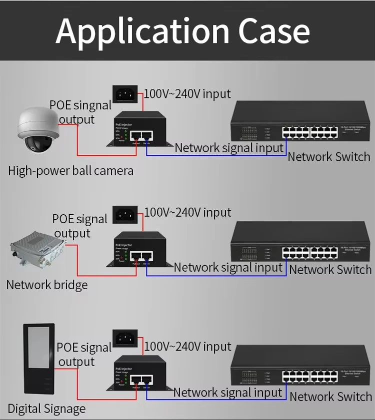 Machinatum pro versatilitate, hoc injector retrorsum cum 802.3af/at machinis compatitur. Est specimen pro posse cameras PTZ, summus perficiendi accessus wireless puncta, et instrumenta conferendi video. Productum simplex obturaculum et solutionem fabularum praebet, necessitatem eliminans exitu electrica addito et multiplicitatem institutionis minuendi in inceptis et applicationibus industriae.