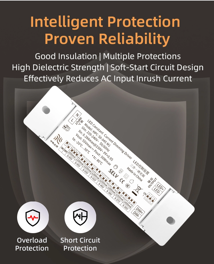 Multiplex Praesidium Design: constructum cum quattuor machinationibus tutelae: overvoltage (praesidium limen ≥55V), supercurrent (limen tutelae ≥0.18A), ambitus brevis, et overheating (praesidium temperatum ≥110℃). Exitus cito abscindere potest si condiciones abnormes operantes ut rectorem defendat et fontes levis a damnis adduxerit.