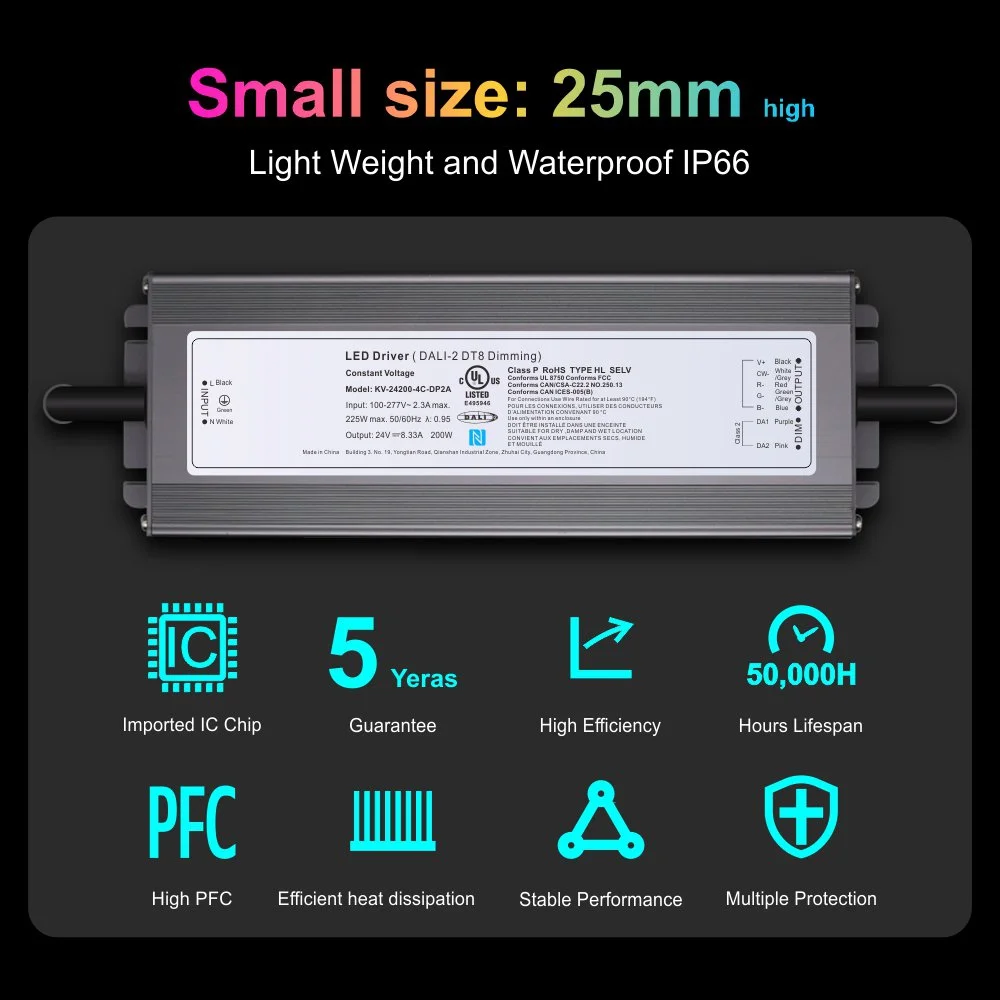 Hoc productum est DALI Constant Voltage 200W CCT Coegi Dimmable DUXERIT, repraesentans solutionem provectam pro summo fine commerciali et callido domicilio accendi potestate. Ut nucleus componentis plene obsequentem cum vexillum DALI 2 DT8 Dimmable 200W LED Driver, non solum dat splendorem levem ac sine tionibus temperatura, sed etiam, per DT8 protocollum extensum, accuratam et digitalem administrationem coloris temperaturae (CCT) ac etiam coloris (RGB) lucis praebet, designantes inaudito dynamico lumine et umbra creationis facultatem praebens.