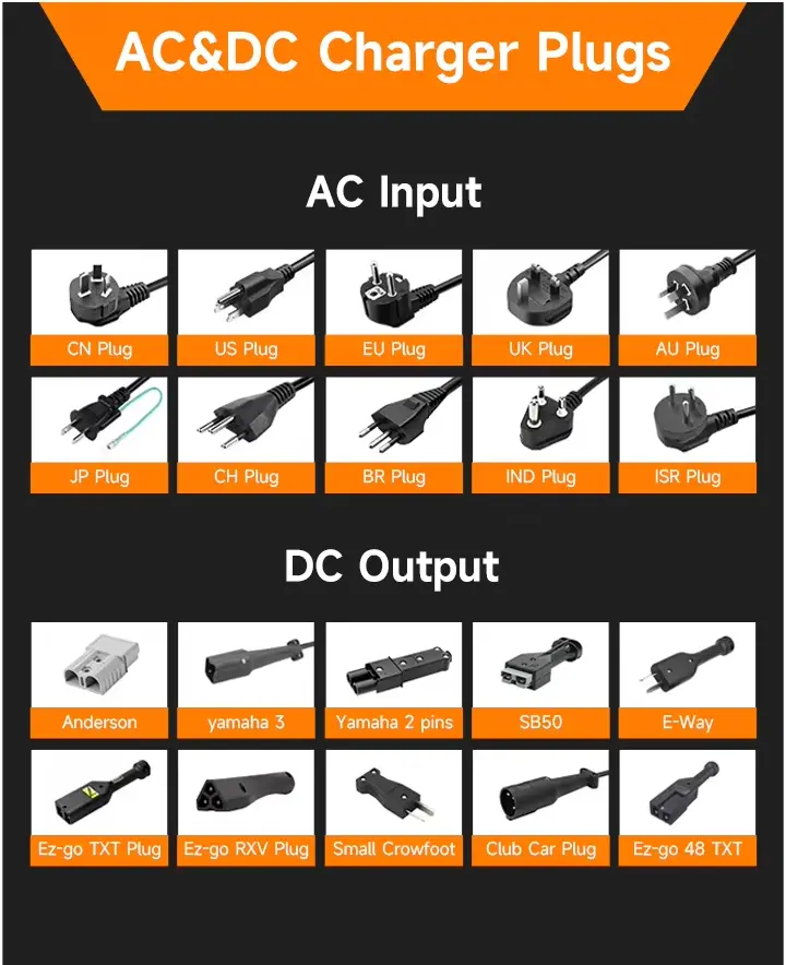 UE plug, plerumque EU nationes ut Germania, Gallia, Nederlandia, Dania, Austria, Suecia, etc. The UK plug, usually for Britain, India, Pakistan, Singapore and etc. AU plug, plerumque pro Australia, Nova Zelandia, Argentina et etc. Communes DC connexiones in foro includunt Anderson, EZ-go, DS Club Car et Yamaha Connector, etc.